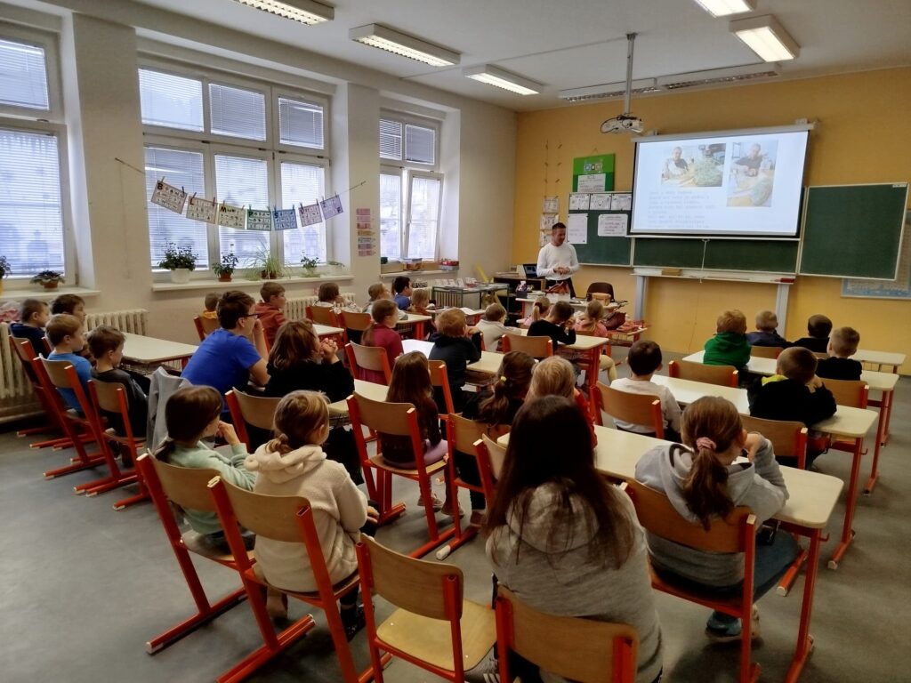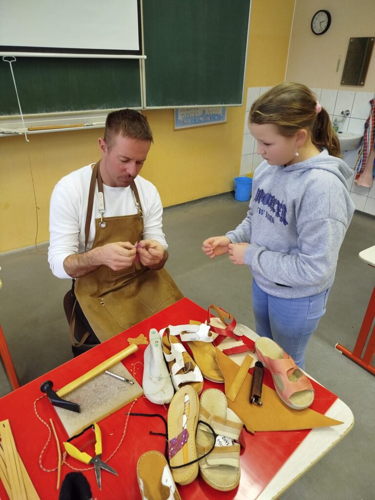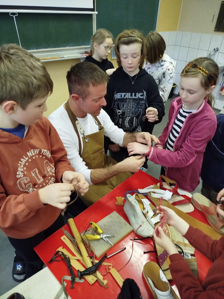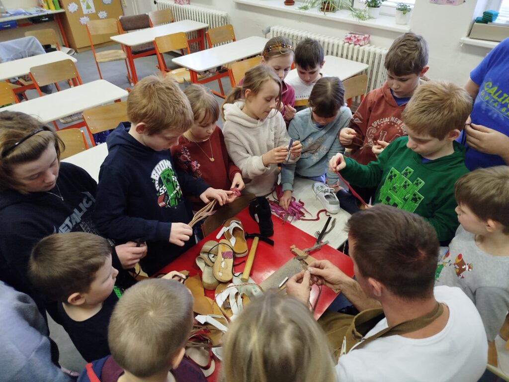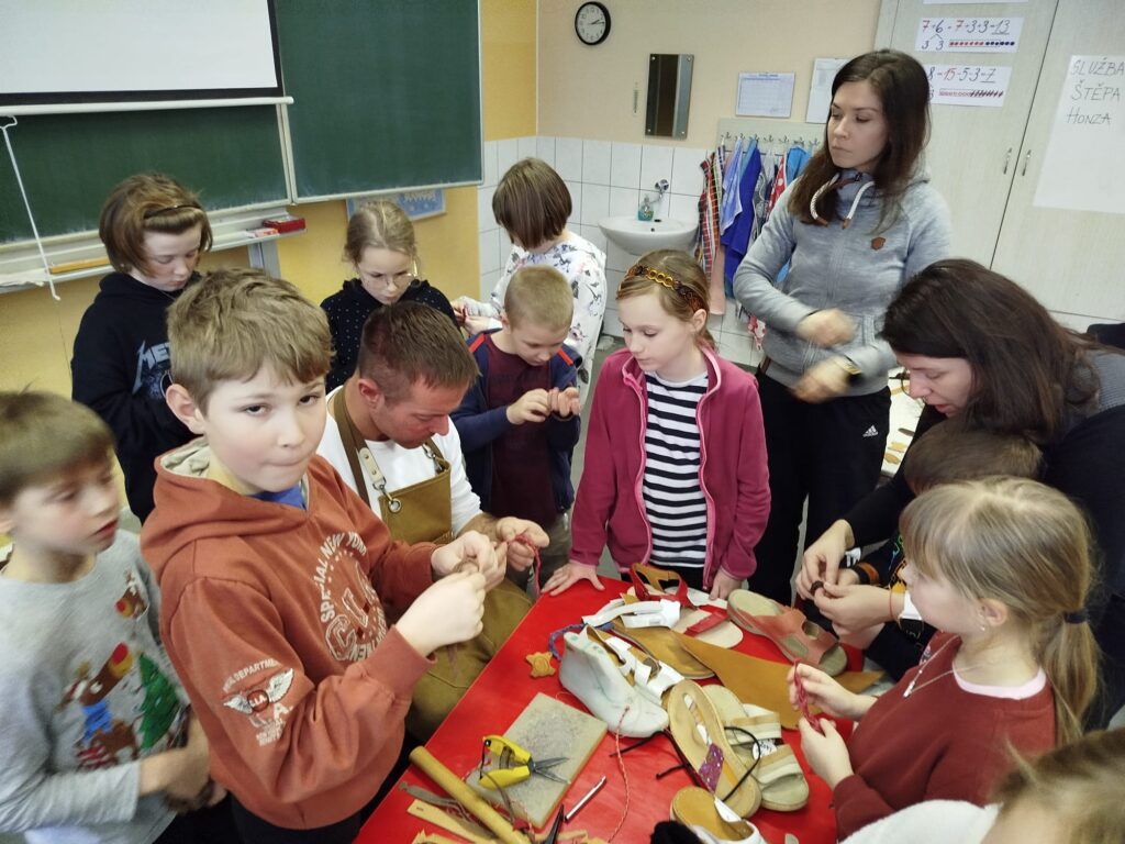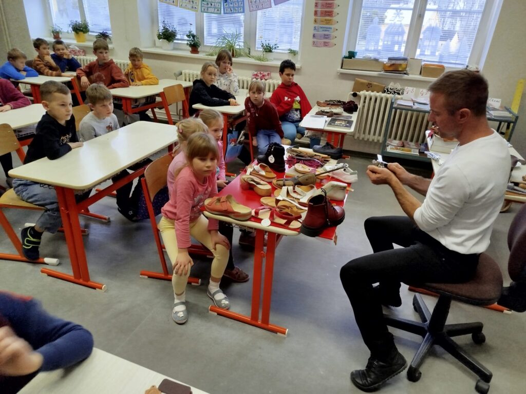 Ve čtvrtek se konal další z projektových dnů. Do školy tentokrát zavítal obuvník pan Kocourek a seznámil děti nejen s vývojem chodidla, ale i se způsobem šití obuvi v letech předešlých. Děti si vyrobily i kožené náramky.