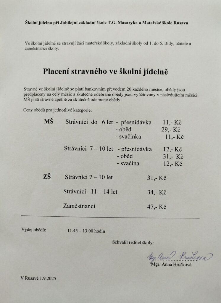 Od 1.září 2025 dochází k navýšení cen stravného ve školní jídelně.