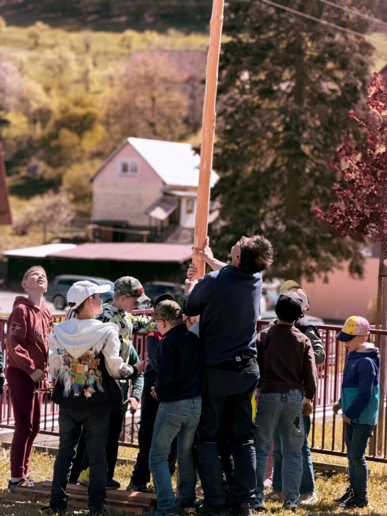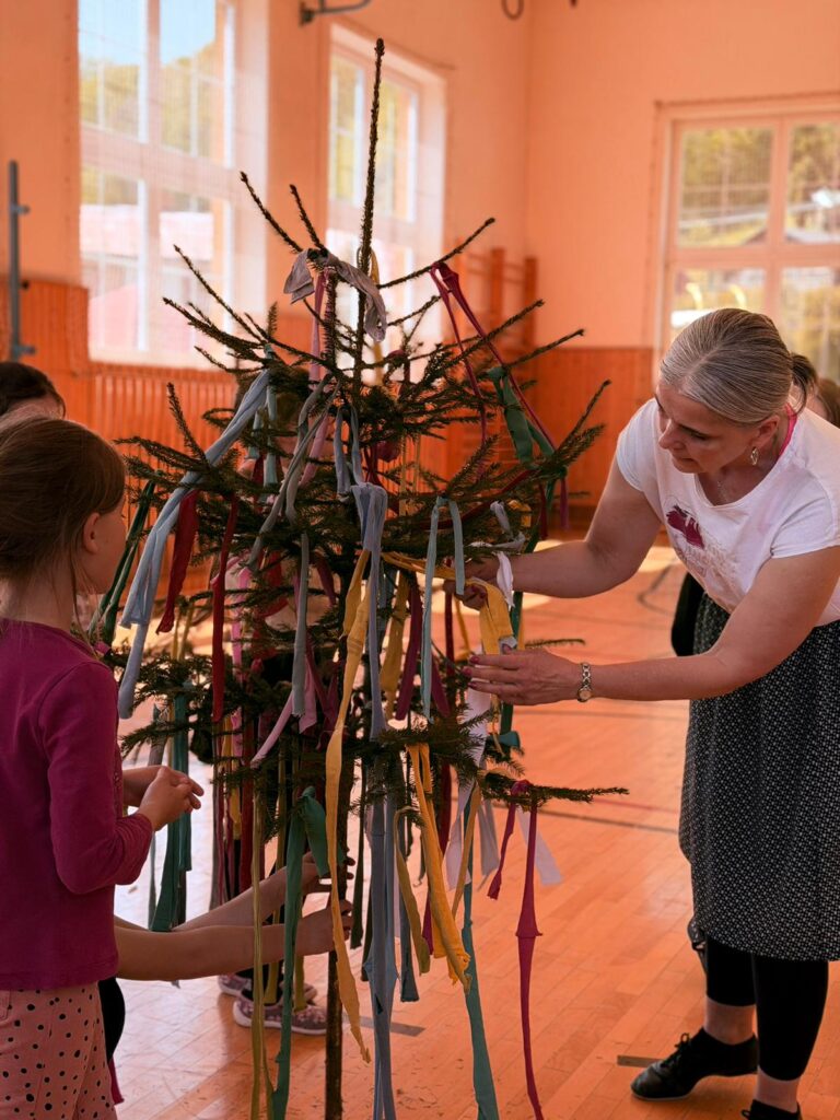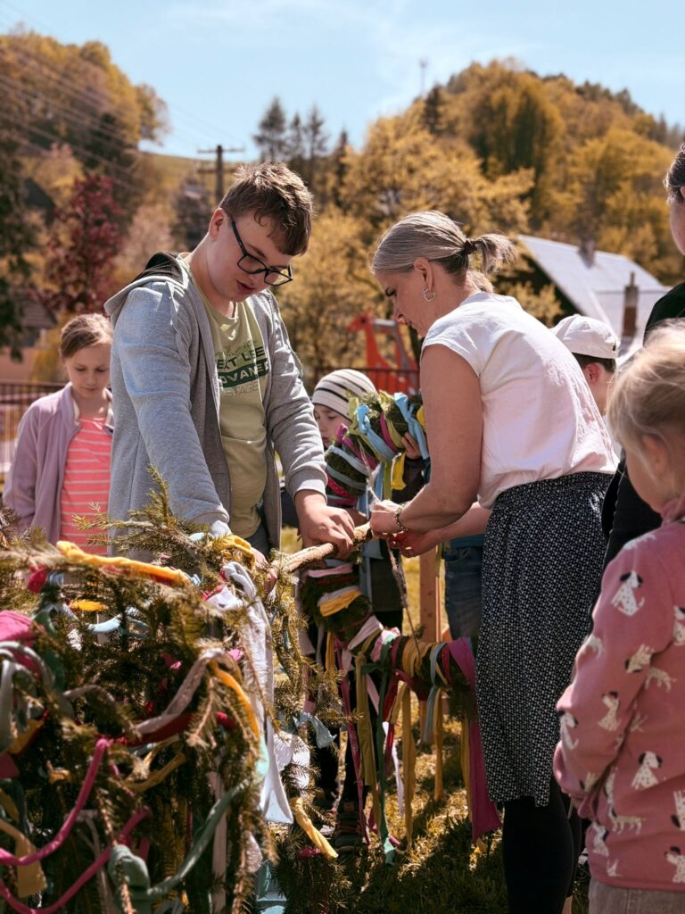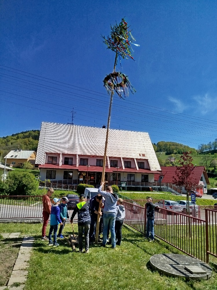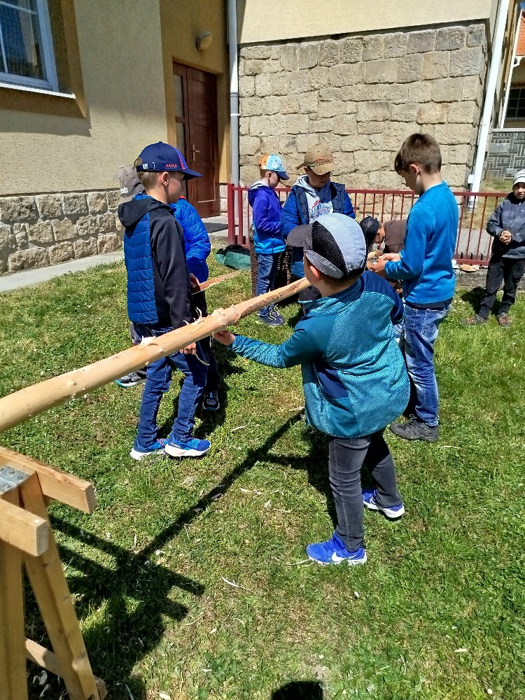 Další projektové odpoledne probíhalo souběžně v tělocvičně, kde děvčata zdobila věnec na májku a na zahradě, kde pracovali chlapci. A zase po roce nám zahrádku zdobí krásná májka, kterou si na konci měsíce května společně pokácíme.
