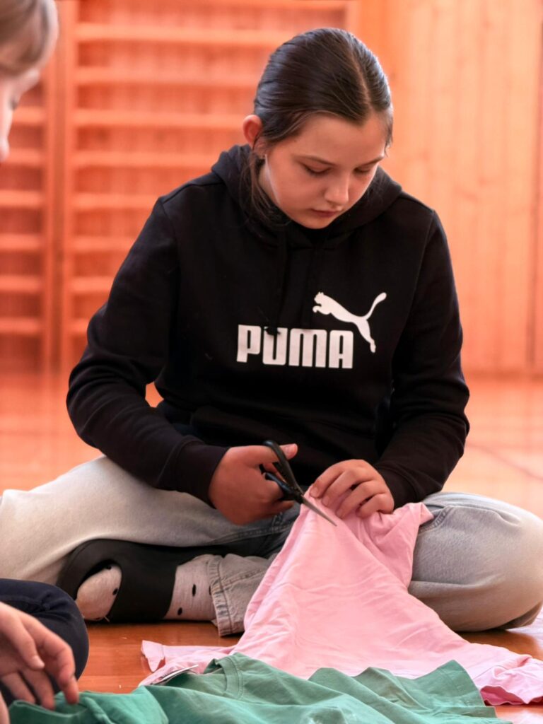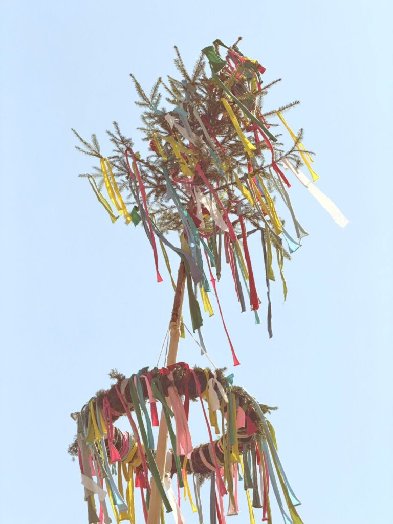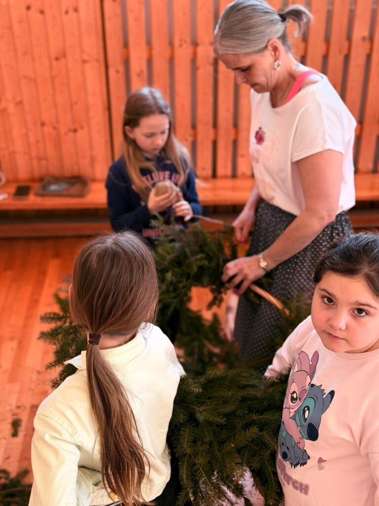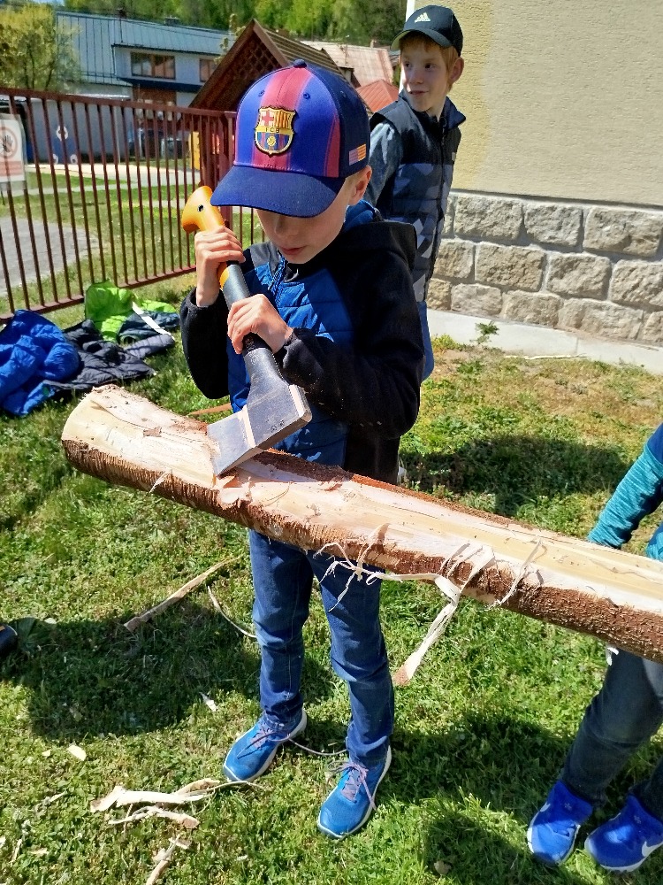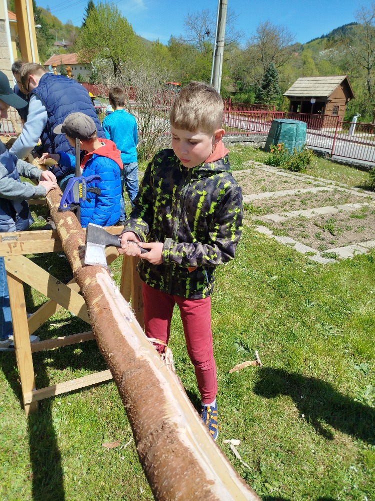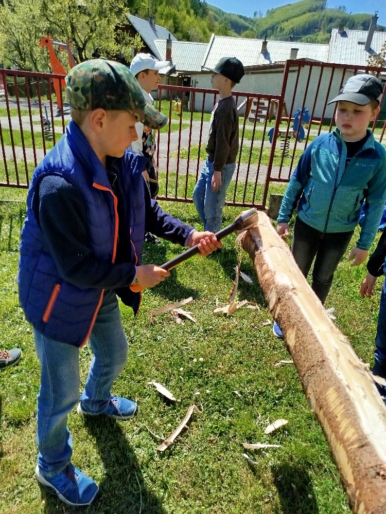 Další projektové odpoledne probíhalo souběžně v tělocvičně, kde děvčata zdobila věnec na májku a na zahradě, kde pracovali chlapci. A zase po roce nám zahrádku zdobí krásná májka, kterou si na konci měsíce května společně pokácíme.